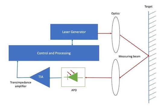 圖 2. 激光測距儀和其他飛行時間應用使用InGaAs APD作為紅外傳感器,通常波長為1550nm。