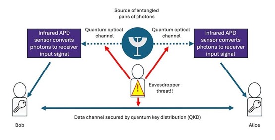 在量子密鑰分發(QKD)系統中,通過光通道傳輸量子比特可實現安全通信(圖 3)。InGaAs APD在檢測QKD中用作量子比特的單光子方面發揮著重要作用。它們的高響應度和低噪聲特性使其成為確保量子通信系統安全和可靠的理想選擇。