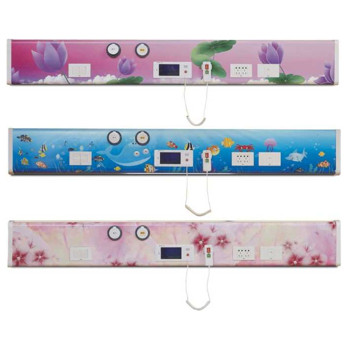 適用 兒科病房、產(chǎn)科病房等I尺寸Size高220mm 厚60mm 壁厚 1.5mmI 材質(zhì) Texture優(yōu)質(zhì)鋁合金| 表面 Surface靜電噴塑I 特點(diǎn) Characteristic?四腔結(jié)構(gòu),氣電分離;?上下小圓角組合,可選不同顏色 組合,美觀大方;?每床標(biāo)配護(hù)眼LED閱讀燈、氧氣 負(fù)壓終端、開(kāi)關(guān)各1個(gè),十孔插座 2個(gè);?可選配空氣終端、