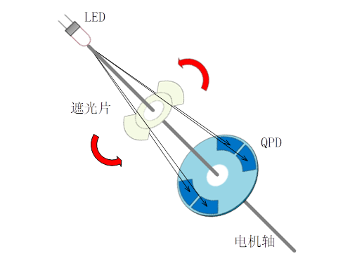 位置檢測器是檢流計的核心部件之一,它集成于檢流計的底部,通常為一組高度定制化的四象限光電探測器(QPD),其有著高分辨率、高靈敏度、快速動態響應等優點。在檢流計中,電機、LED、遮光片和QPD四者的中心同軸,當電機軸轉動時遮光片也會隨之旋轉,通過檢測QPD上的光斑可以計算出反射鏡的實時偏轉角度。
