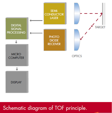 高爾夫測距儀一般采用dToF原理,激光器向目標(如旗桿)發射經過準直的脈沖激光,經目標反射后,由探測器接收。通過計時器獲得發射脈沖與接收脈沖之間的往返時間差Δt以及光速c,可以計算出目標的距離D。