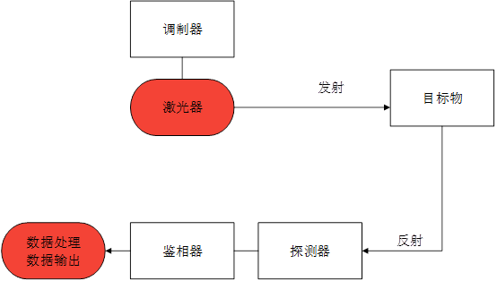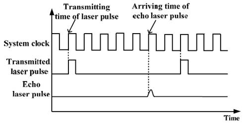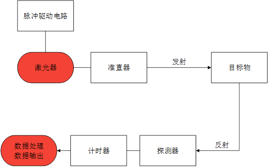 激光器向目標發射脈沖激光,經目標反射后,由探測器接收。通過計時器獲得發射脈沖與接收脈沖之間的往返時間差Δt以及光速c,計算出目標的距離D。